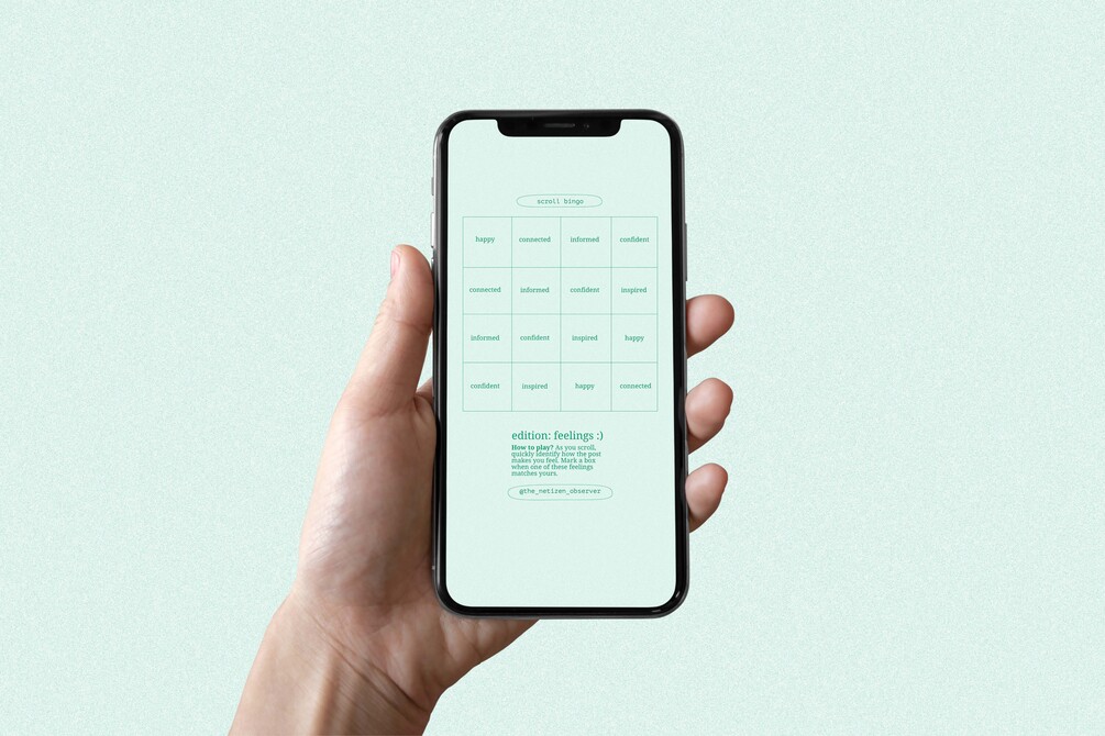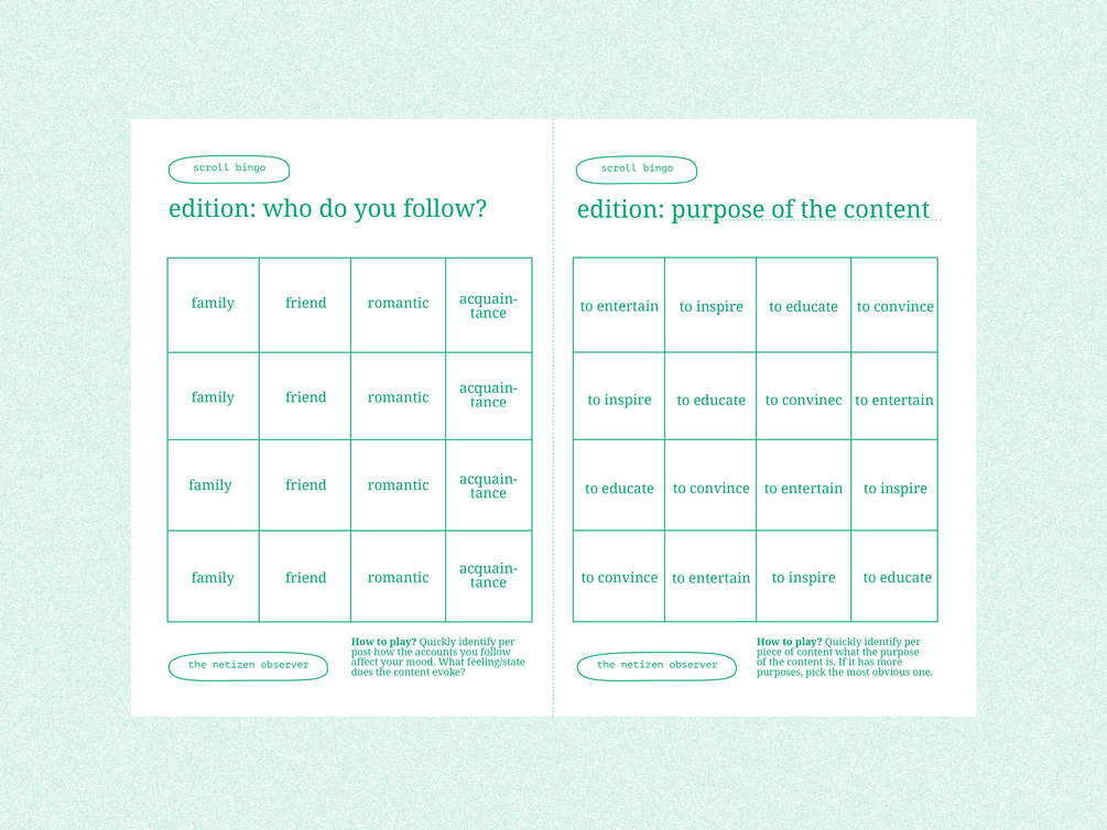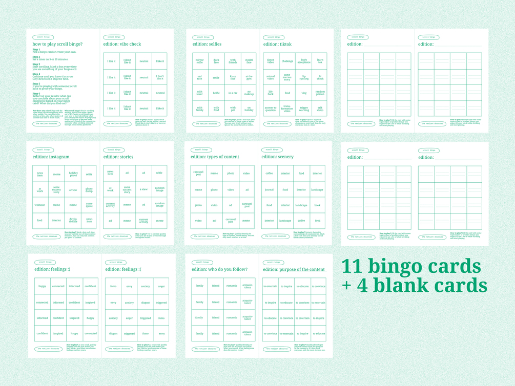 Scroll bingo is a playful way to explore the content you consume during a single scroll session. Do you like what you see? What topics do you scroll through? Who do you follow? How does scrolling affect your feelings?